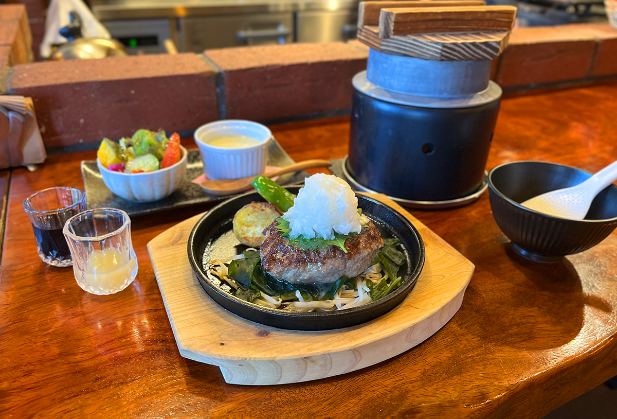 肉々しくて程よい弾力のジューシーハンバーグとふっくらつやつやの羽釜炊きご飯の相性も抜群!