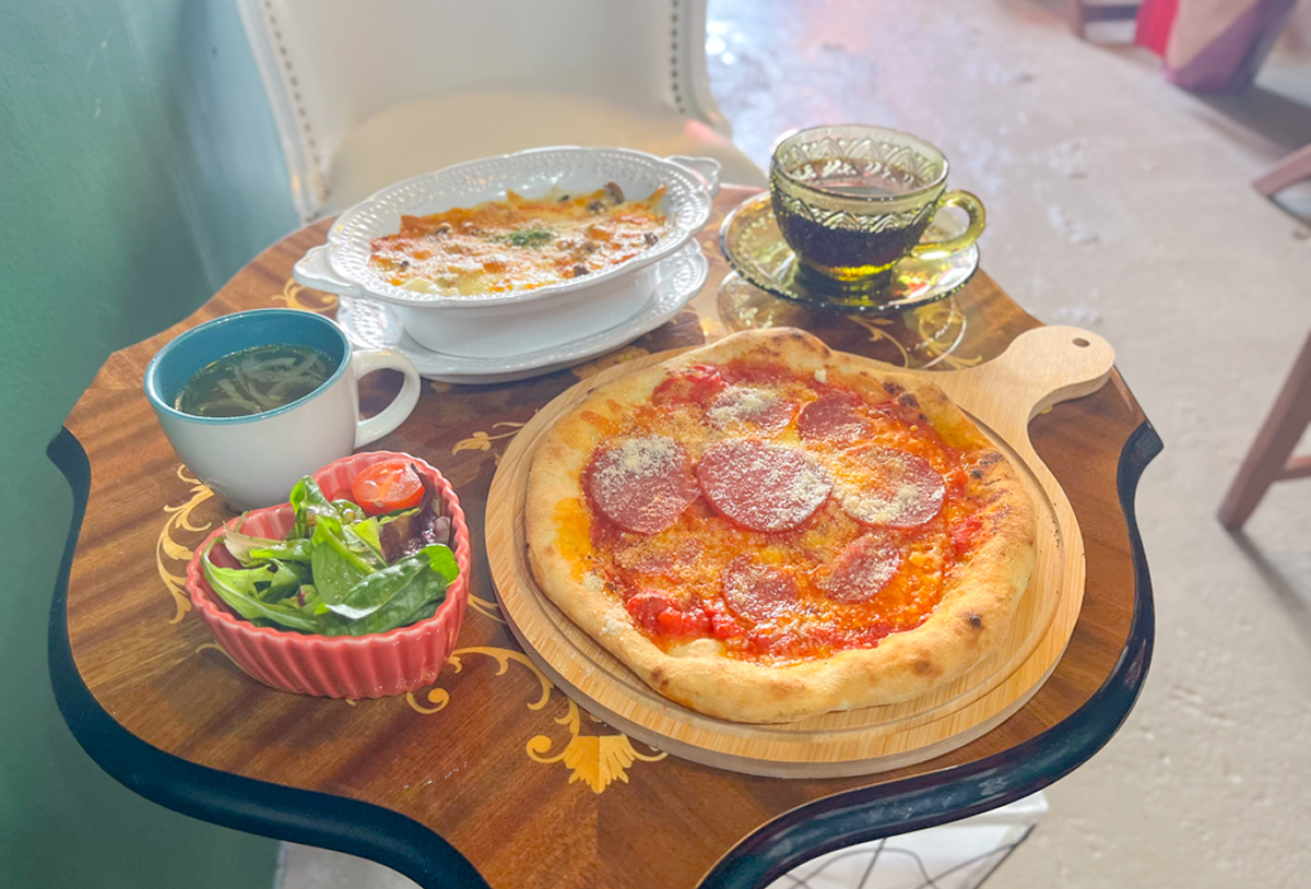 アンティークな雰囲気が漂う店内でいただけるのは、焼き立てピザのオーダーバイキングを含む贅沢なランチコースです。