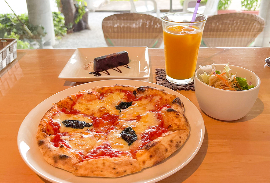 農家を営む店主さんご夫妻が、敷地内の畑で育てた新鮮な野菜を主役に、1年かけて自作したという本格的な石窯で焼き上げるピザが自慢です。