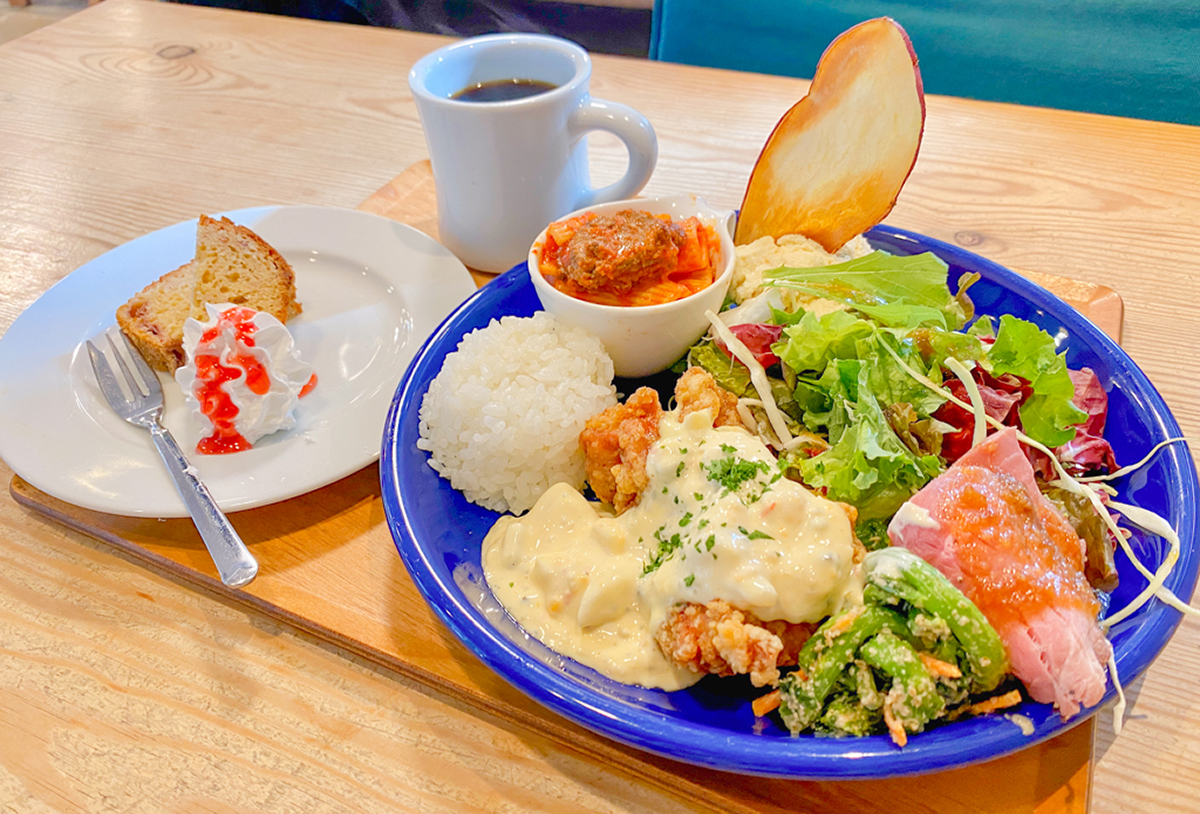 こちらのおすすめは、ボリューム満点の「ランチプレート」。サクサクのスコッチエッグや濃厚なカボチャスープなど、手作りの温かさが詰まった料理がたっぷり。