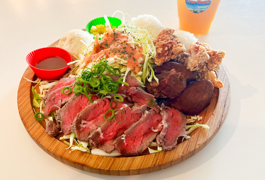 こちらのおすすめは、驚きのボリュームを誇る「ウハウハプレート」。絶妙なレア感のローストビーフに、とろとろのスペアリブ、サクサク食感のモチコチキンが贅沢に盛られた、まさに贅沢な一皿です!