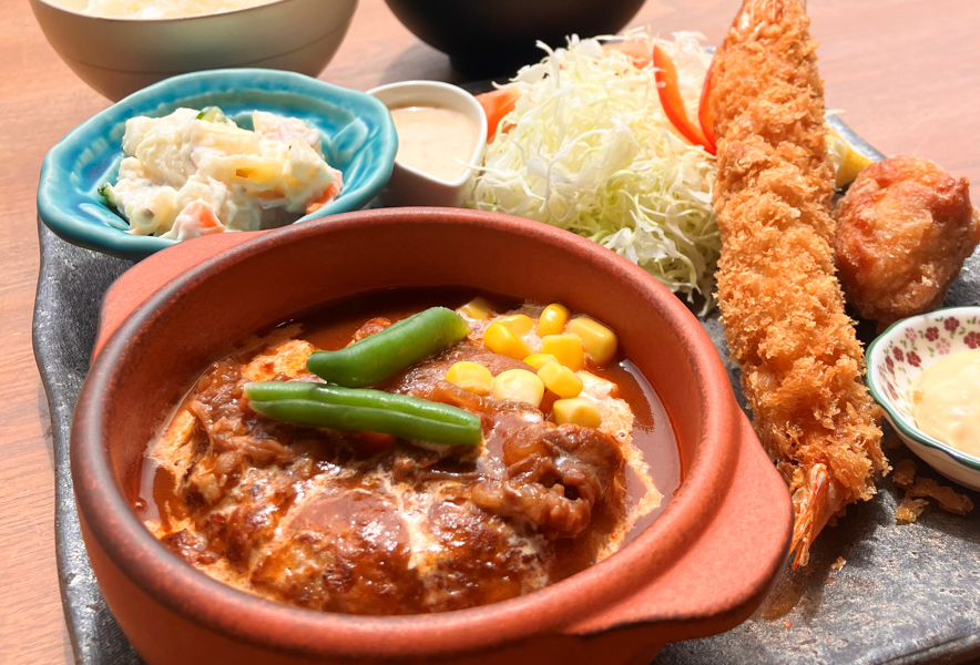 こちらのおすすめは、「むすびプレート」。 メインにはふっくらジューシーの煮込みハンバーグ、サクサクのえびフライや彩り豊かな副菜、さらには具だくさんの豚汁までついたボリューム満点の贅沢ランチです。