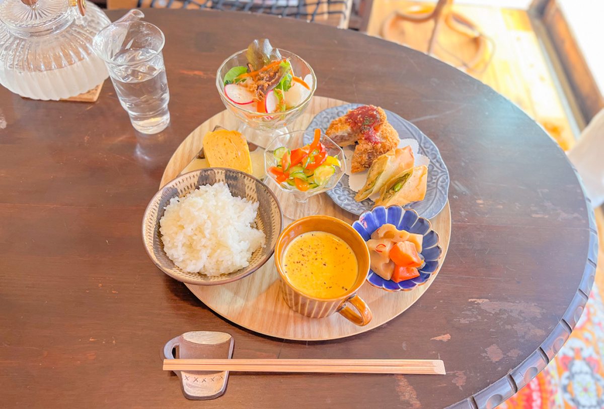 こちらのおすすめは、栄養バランス抜群の「日替わりランチプレート」。にんじんのポタージュや、ふわふわ食感のとうふと枝豆の春巻など、お野菜たっぷりの副菜が彩り豊かに並びます!