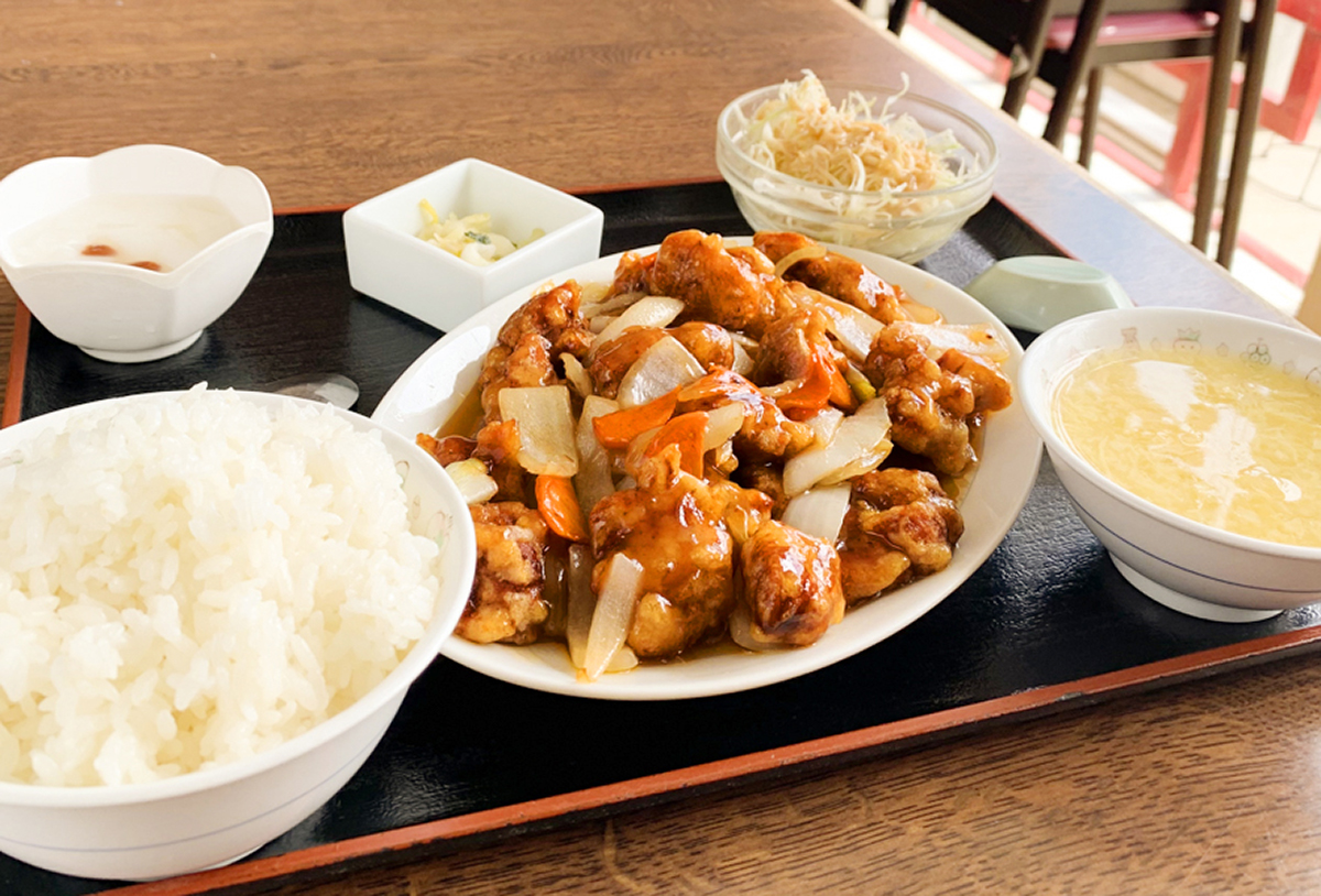 酢豚ランチセットは、外はカリッカリ、中はふっくらで柔らかい豚肉と甘酢の相性が抜群。