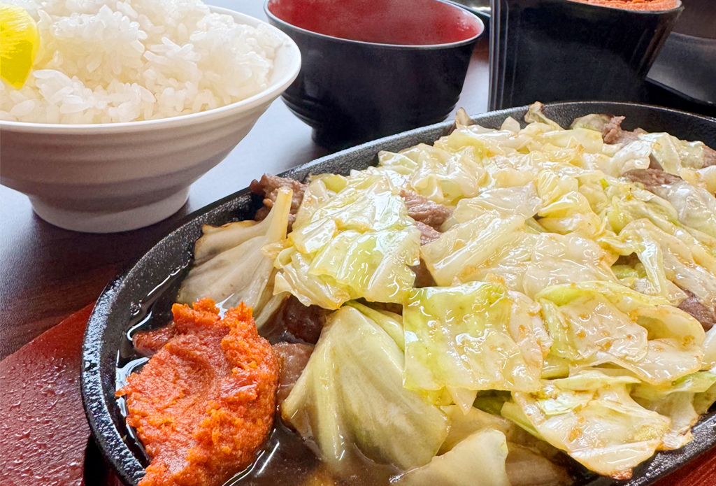 先代から受け継がれる特製のびっくり辛しを油で溶かし、お肉とキャベツに絡めて一口食べるとやみつきに!