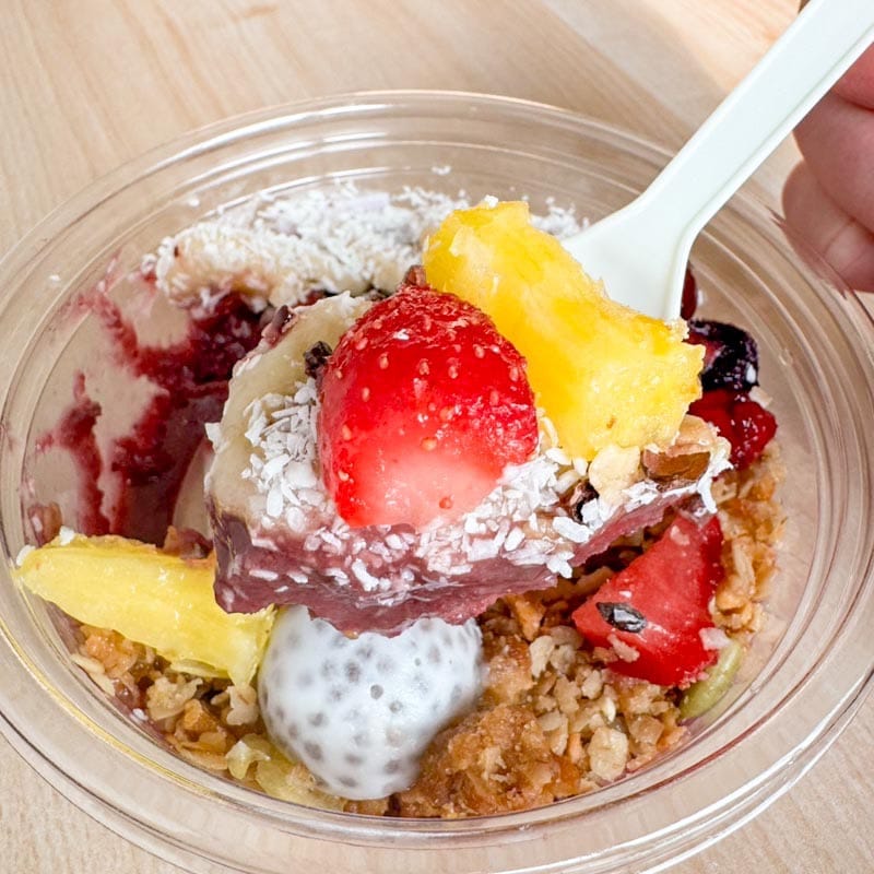 いちごやバナナ、ナツメなど数種類のフルーツと豆乳を合わせてできた贅沢なアサイーボウルは、まろやかでもったりとした舌触りが特徴。