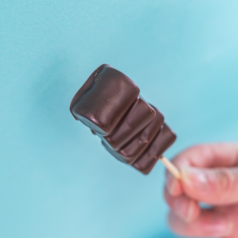 もっちりマシュマロをビターなチョコレートでコーティングしたチョコマシュマロは絶品。
