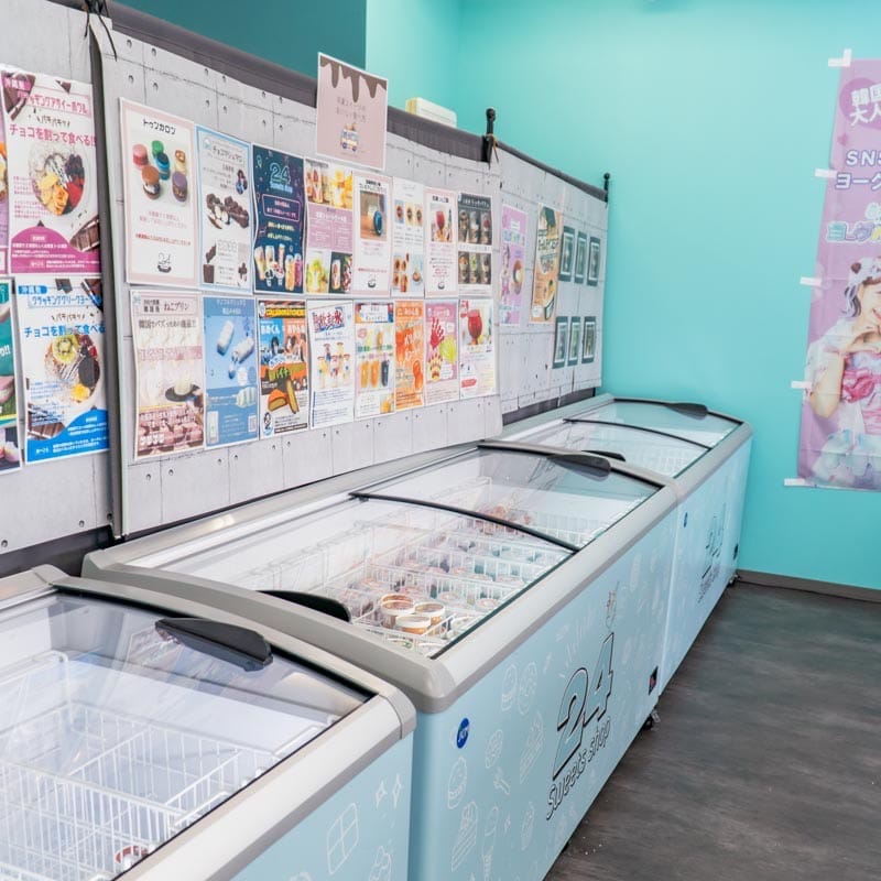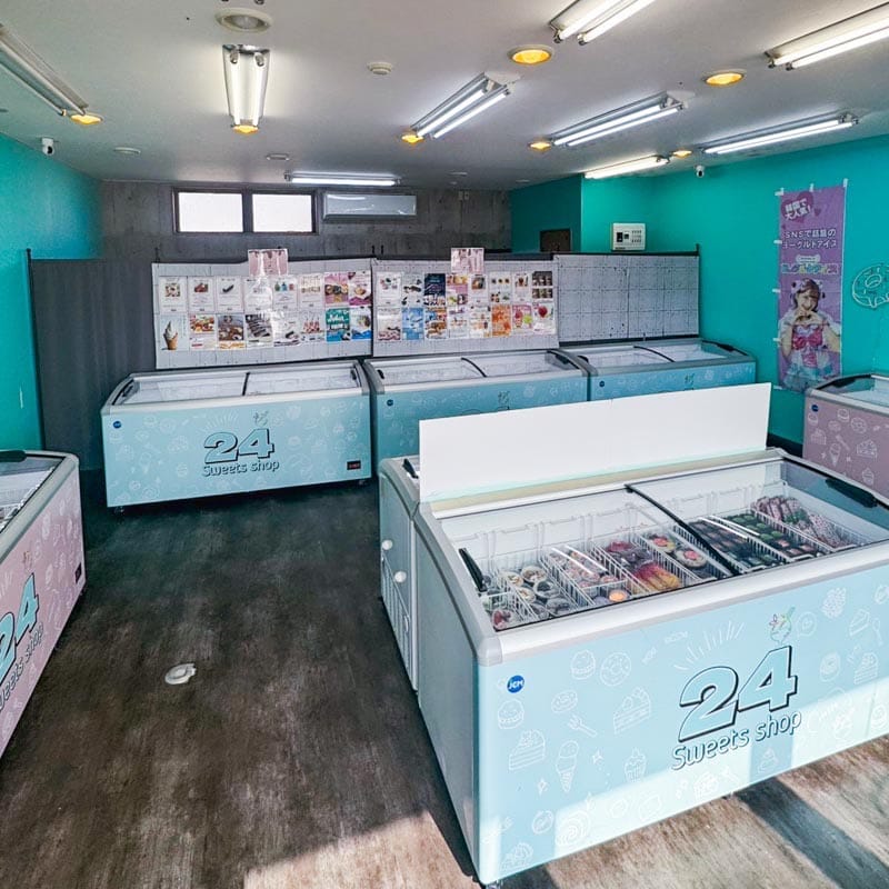 ティファニーブルーの壁紙と24sweets shopのロゴが入ったショーケースが映えますね♪