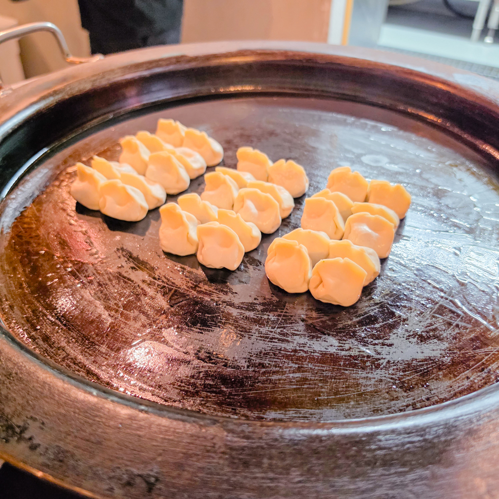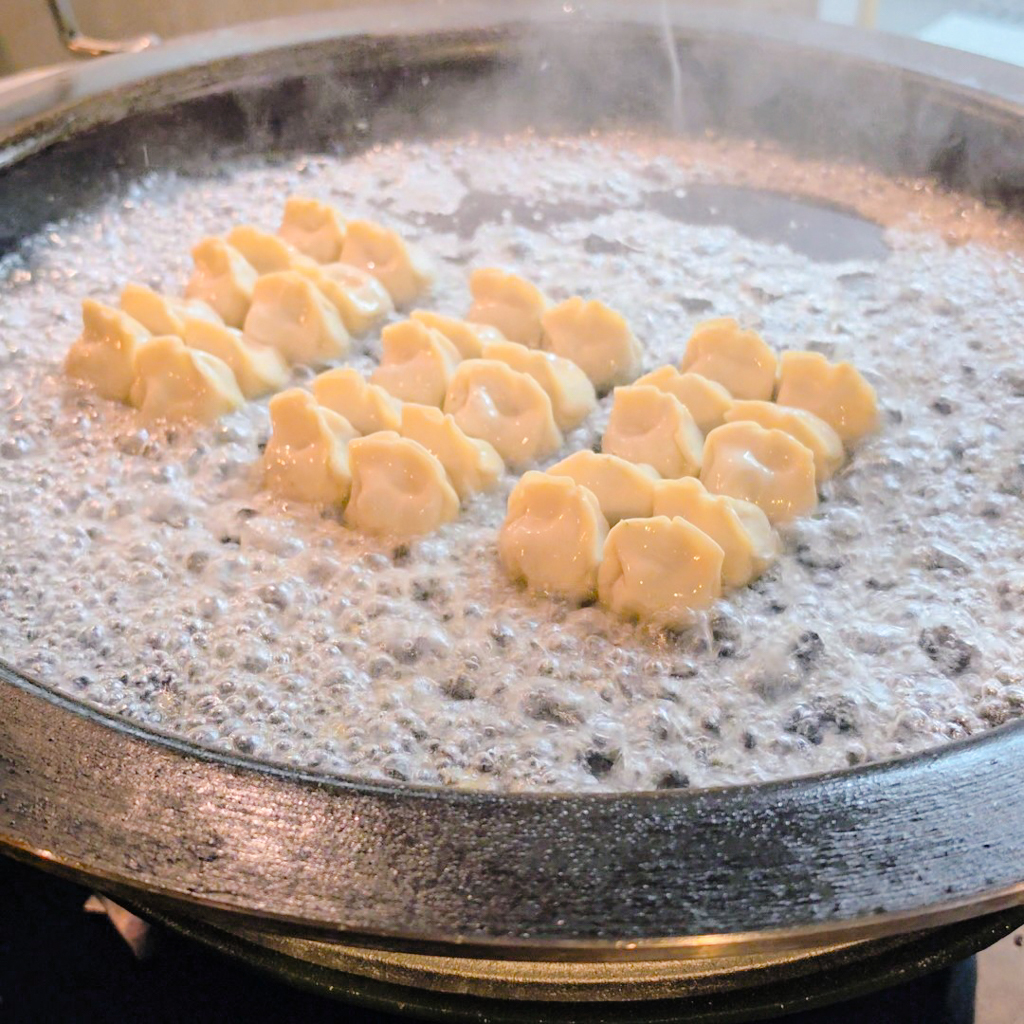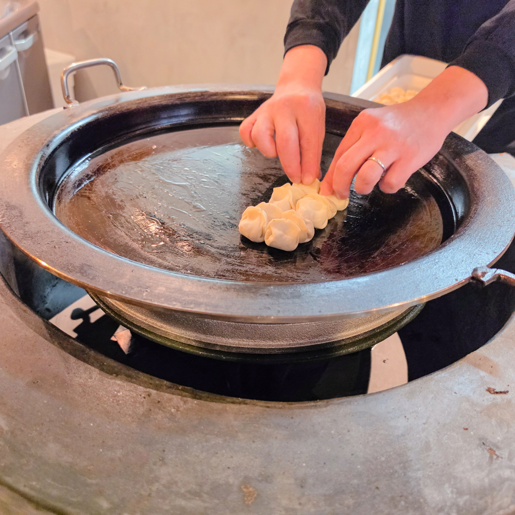 アツアツに熱された鉄鍋で焼き上げられる餃子。