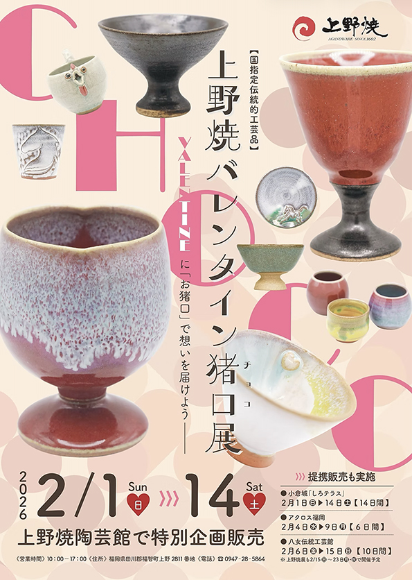 2月1日(日)~2月14日(土)までの期間、上野焼陶芸館で「第19回 上野焼バレンタイン猪口(チョコ)展」が開催されます。