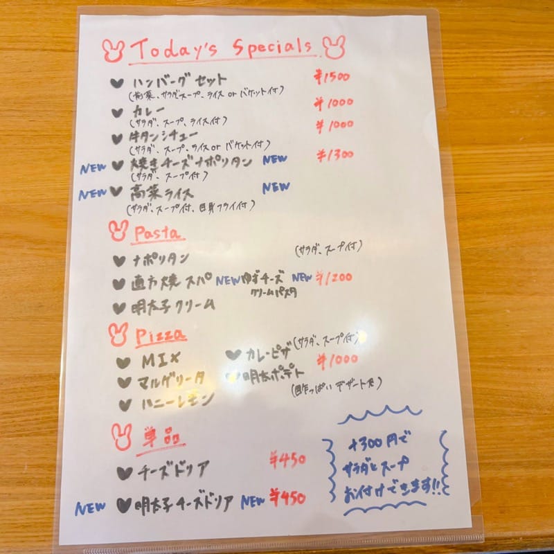 メニューはパスタ、ピザ、カレーなど、幅広く揃っています。