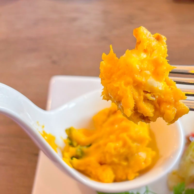 まず、かぼちゃとクリームチーズを合わせた一品。細かく砕いたナッツの食感がアクセントに。
