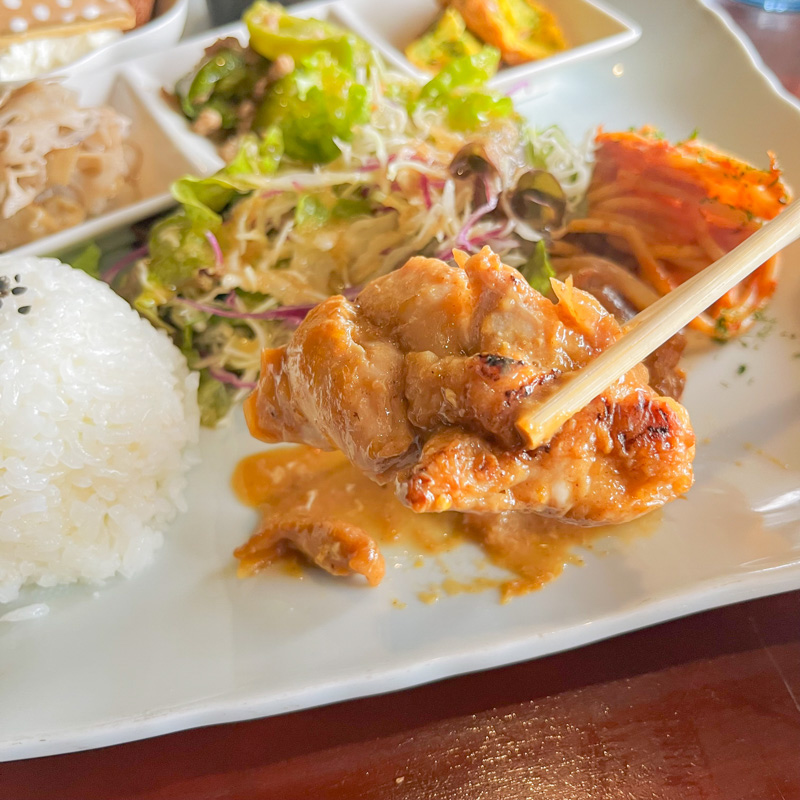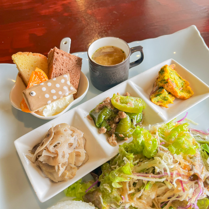 女性はもちろん「いろいろなおかずを少しずつ楽しみたい」という方にぴったりの、品数豊富な欲張りランチ。日替わりのメインに加え、色とりどりの副菜が並びます。