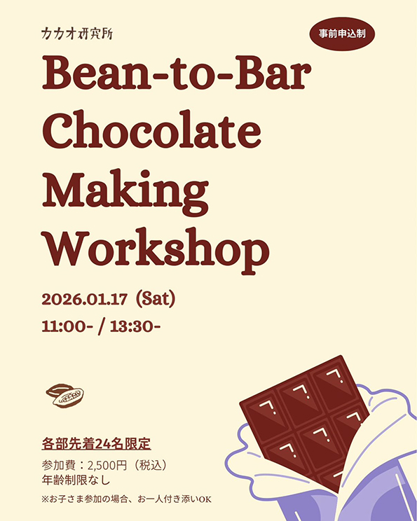 新しい年を迎え、今年もチョコレートの季節が近づいてきました。このワークショップでは、カカオ豆がどのような工程を経てチョコレートになるのかを学びながら、実際にチョコレート作りを体験することができます。
