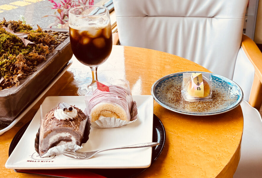 そこで、今回はサービスして頂いたアイスコーヒーとともに「宮若香梅」「紫いも」「チョコロール」の3品を頂きました。