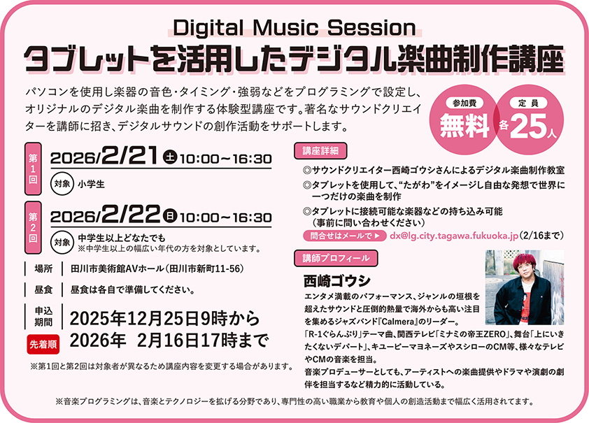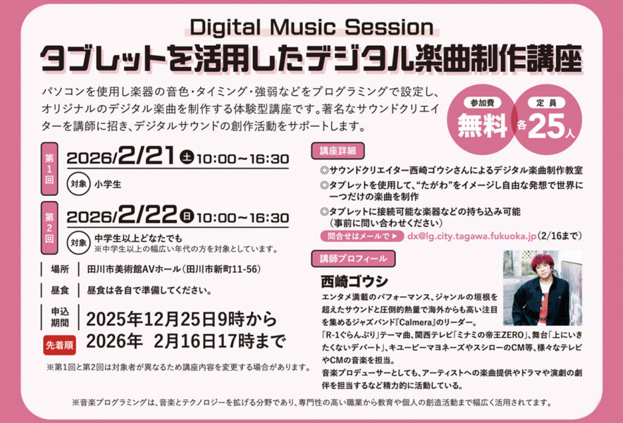 2月21日(土)・22日(日)、田川市美術館で「タブレットを活用したデジタル楽曲制作講座」が開催されます。
