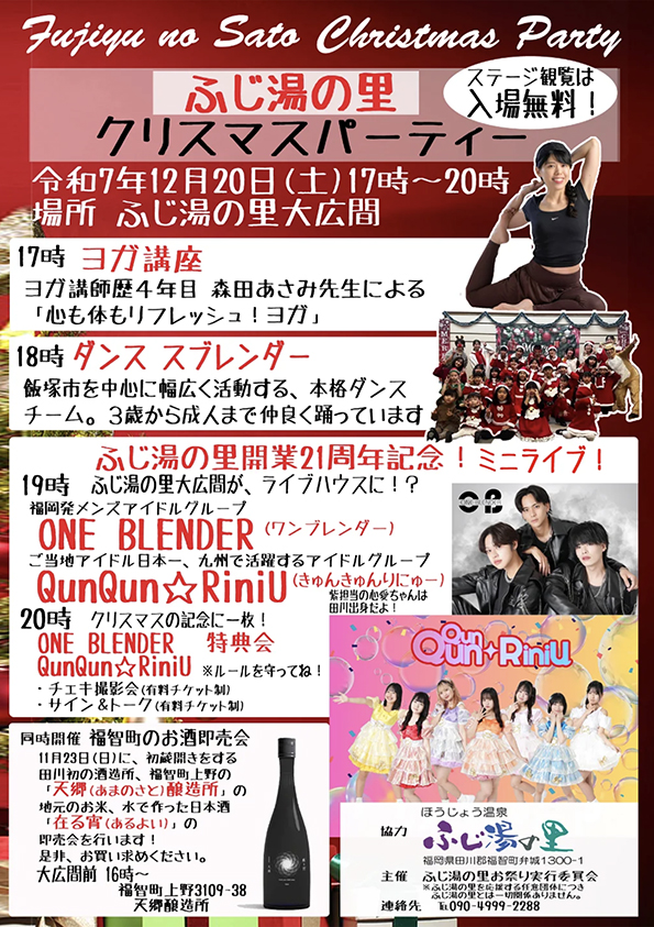 19時からは「ふじ湯の里 開業21周年記念!ミニライブ」が行われ、福岡発メンズアイドルグループ「ONE BLENDER」、さらに九州で活躍中の「QUNQUN☆RiniU」が登場!ライブ後には有料チェキ会やサイン会も予定されています。