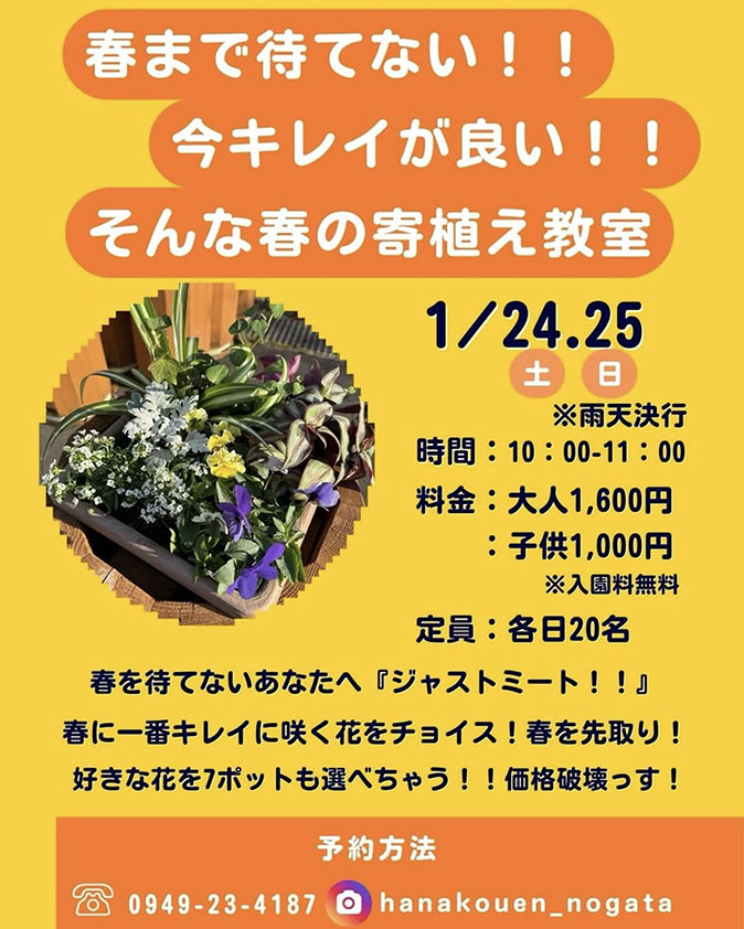 1月24日(土)・25日(日)、福智山ろく花公園で「寄せ植え教室」が開催されます。
