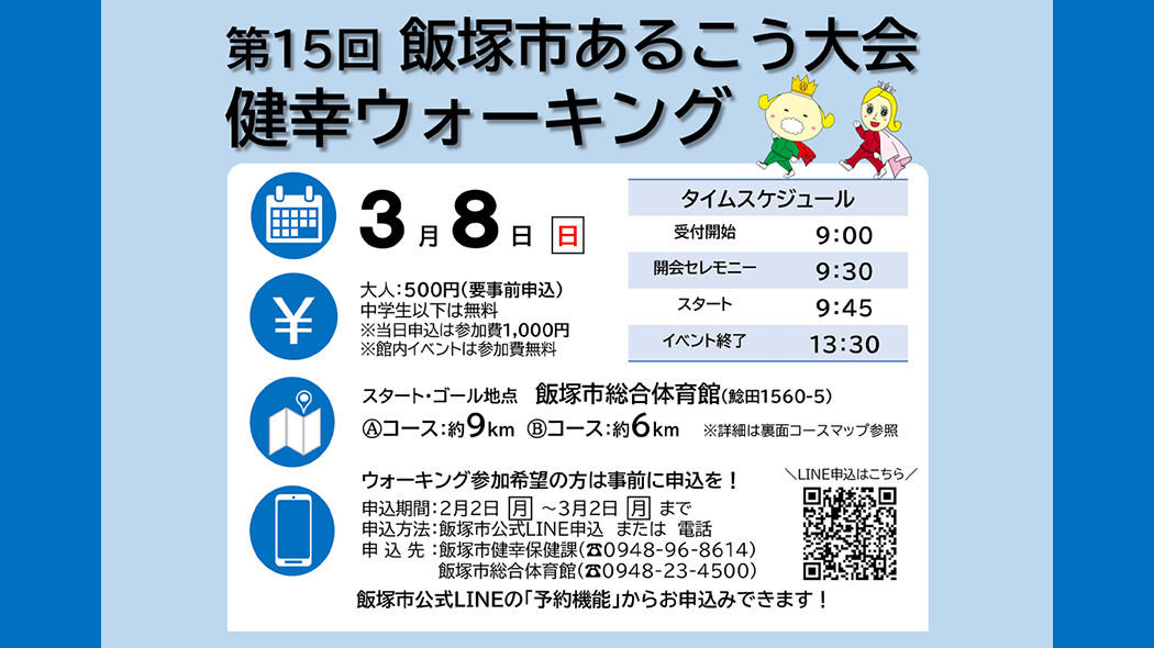 3月8日 @ 9:00 AM - 1:30 PM 第15回 飯塚市あるこう大会 健幸ウォーキング 飯塚市総合体育館 鯰田1560-5 飯塚市 福岡県 3月8日(日)、飯塚市総合体育館を拠点に「第15回 飯塚市あ […]