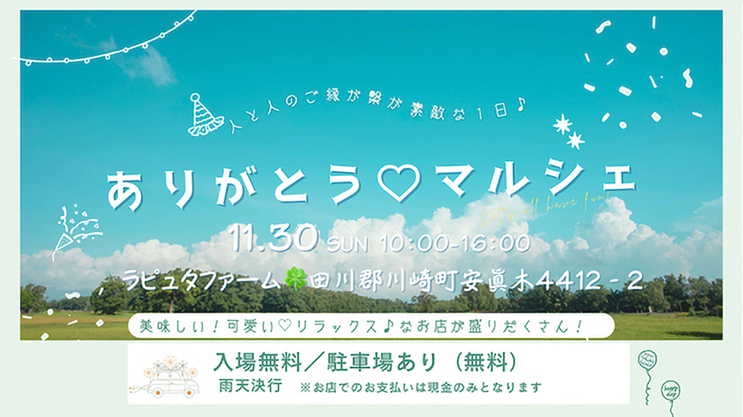 11月30日(日)、ラピュタファームで「ありがとう♡マルシェ」が開催されます。 素敵なお店が集まる初開催のマル […]