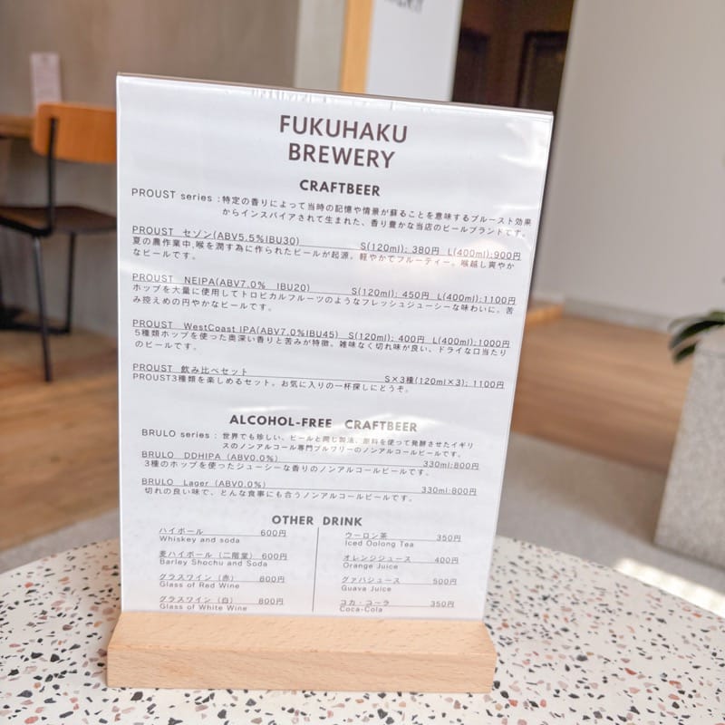 メニューには、オリジナルブランドのPROUSTシリーズ3種類のビールのほか、ハイボールやワインなどがあります。