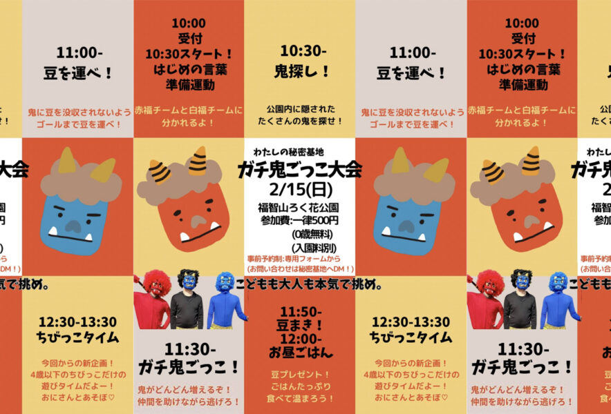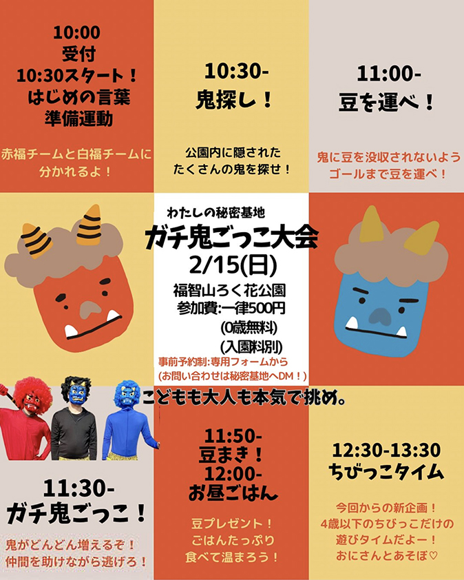現役ママさんによる任意団体「わたしの秘密基地」が主催する外遊び企画も丸1年を迎え、2月は節分にちなんだ大人も子どもも本気で遊ぶスペシャル回です。