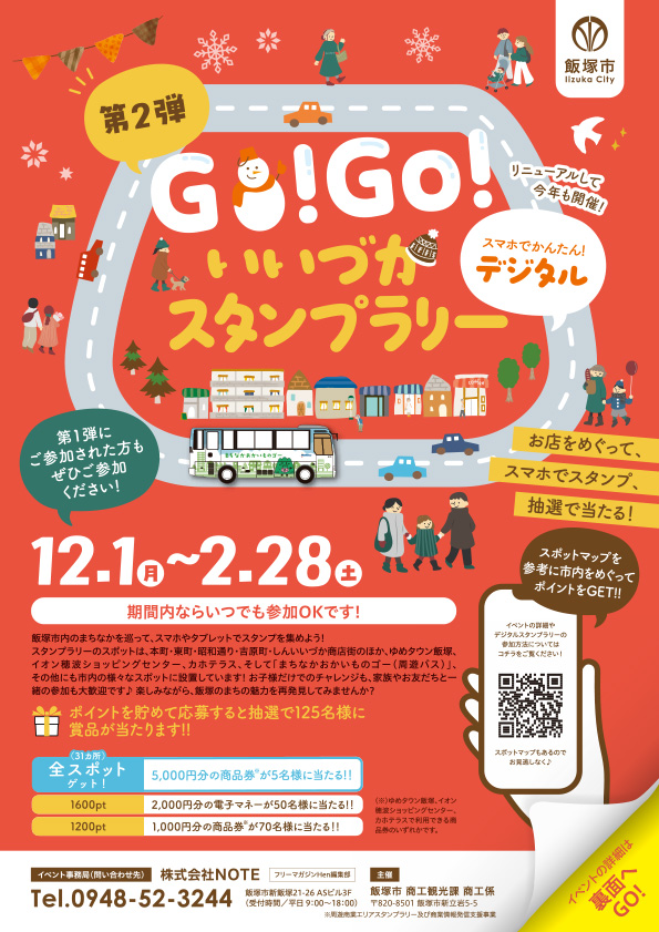 12月1日(月)~2月28日(土)の期間、飯塚市内で「GO!GO!いいづかデジタルスタンプラリー」が開催されています。スタンプスポットは、本町・東町・昭和通り・吉原町・しんいいづか商店街のほか、ゆめタウン飯塚、イオン穂波ショッピングセンター、カホテラス、そして「まちなかおかいものゴー(周遊バス)」その他にも市内のさまざまな場所に設置されています。