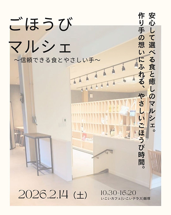 2月14日(土)、いこいカフェ飯塚で「ごほうびマルシェ」が開催されます。