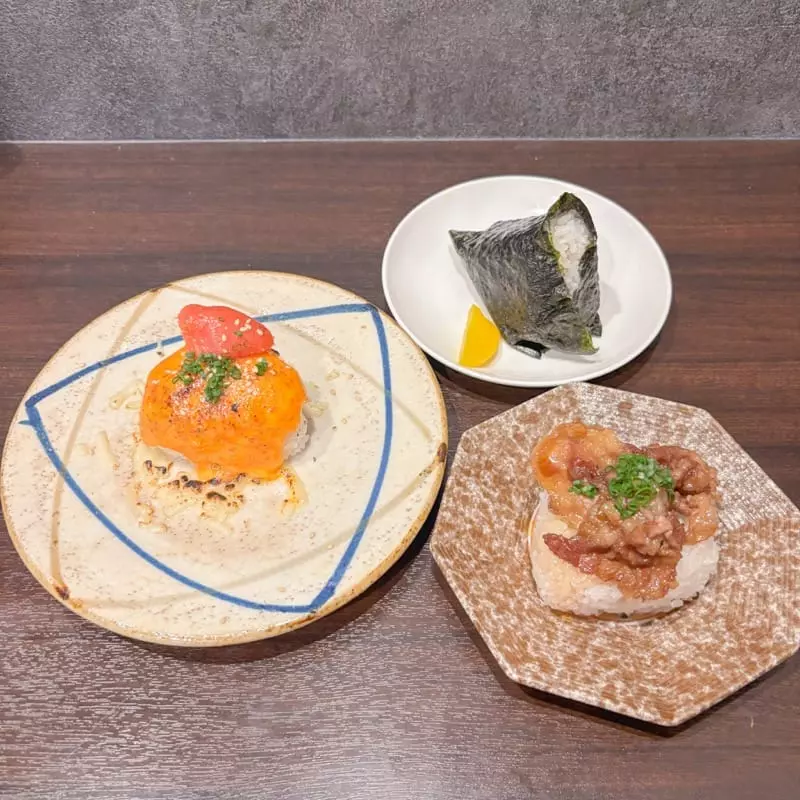 炙り明太マヨチーズ 600円(左)・すきやきおにぎり 600円(右)・卵黄醤油 600円(上)※数量限定