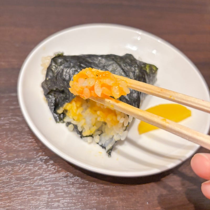 炙り明太マヨチーズ、すきやきおにぎり、卵黄醤油の3種類をいただきます。