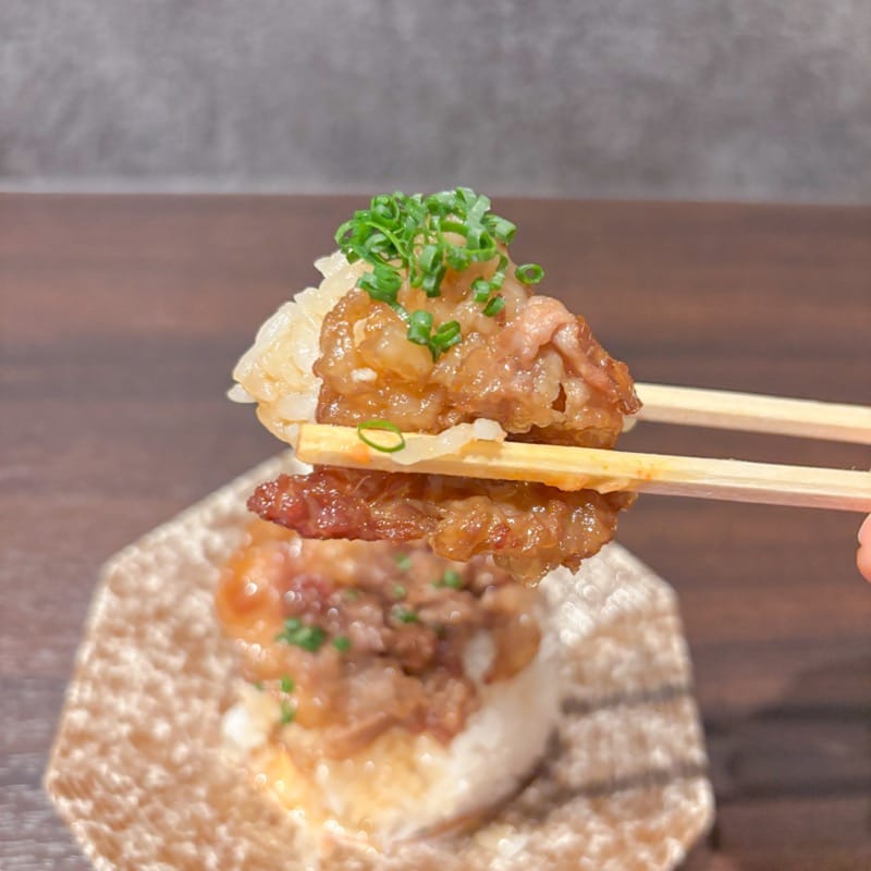 続いて、すきやきおにぎり。甘辛いすき焼きダレがしっかりお肉に染みていて、噛むたびに旨みが広がります。思わずおかわりしたくなるおいしさでした♪