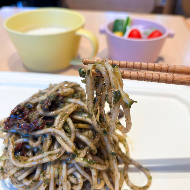 この日のパスタはフレッシュバジルパスタ。運ばれてきた瞬間からバジルのいい香りがします。自家製のバジルソースが本当に美味しくて、米粉の麺によくからんでいます。