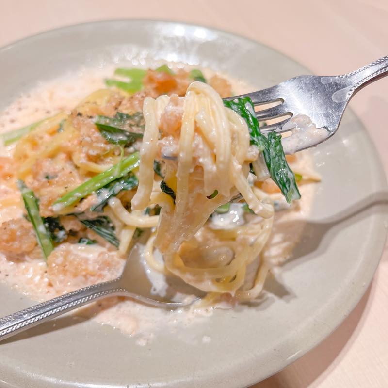 生パスタの「魚介ミンチと小松菜の明太子クリームソース」は麺がもっちもちでクリーミー。海老の風味が香ばしい魚介ミンチがごろごろ入っていて食べ応え十分です!
