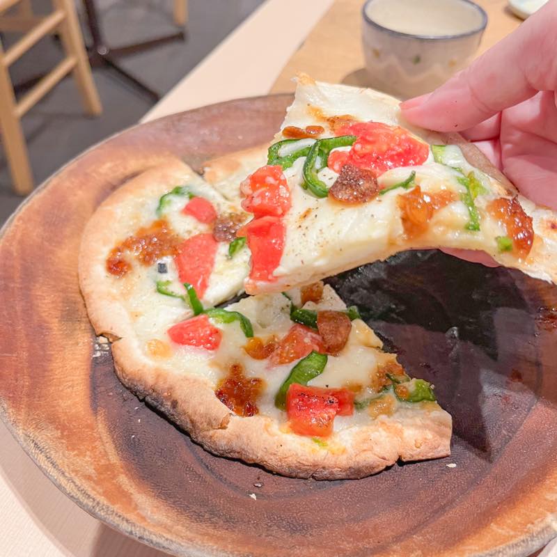 一見シンプルですが、もっちりとしたモッツァレラチーズの食感が楽しく、もろみがアクセントになっていて洋風の中に和風の要素も感じられるピザ。