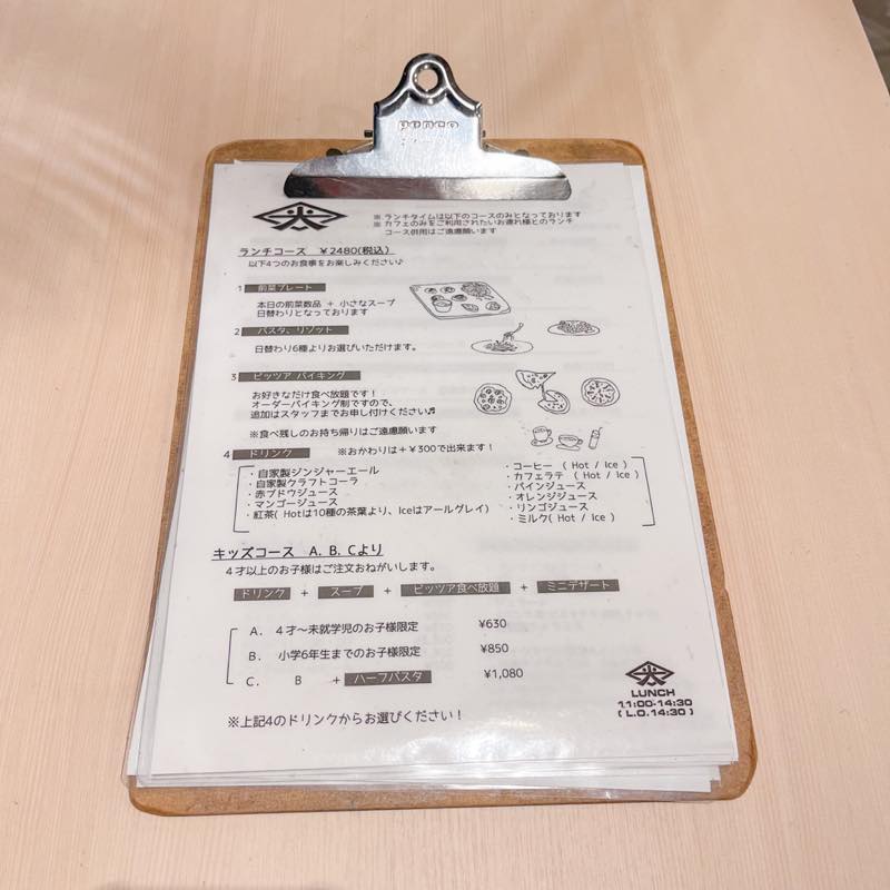 コースの内容は、前菜、パスタ・リゾット6種の中から1品、ピッツァバイキング(食べ放題)、ドリンクとなります。