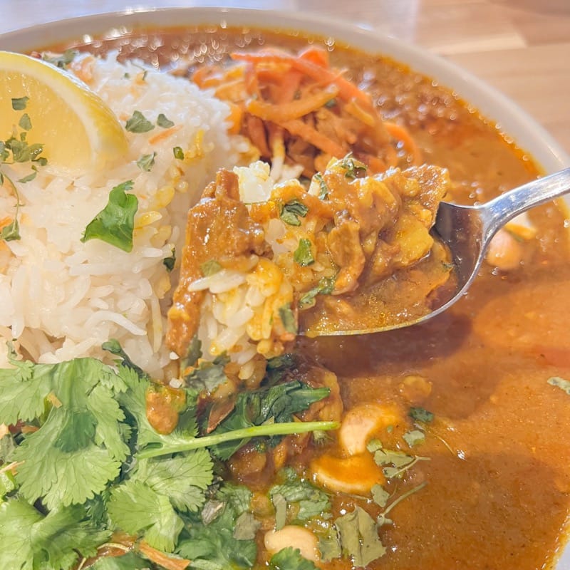 豚の薄切り肉がたっぷり入っていて、食べ応え十分。ビンダル特有の酸味にガーリックの風味がガツンと効いた、中毒性のあるパンチの効いた美味しさです♪
