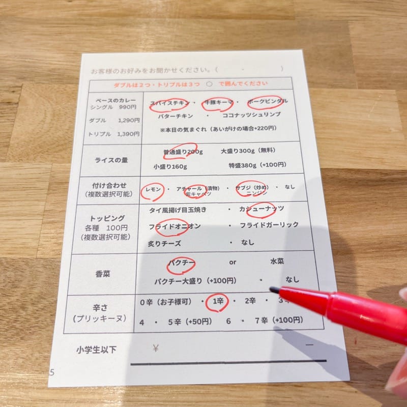 このような注文カードが用意されているので、スパイスカレー初心者さんでも安心です♪ベースのカレーやご飯の量などを選んでマルをつけていきます。