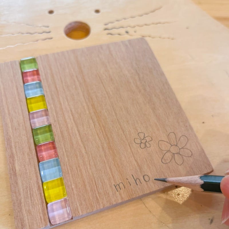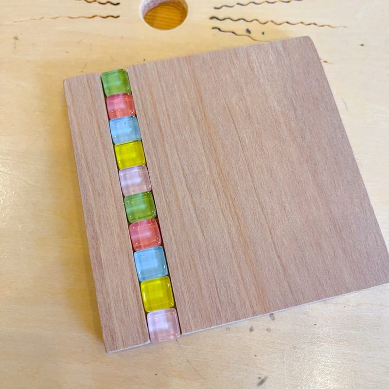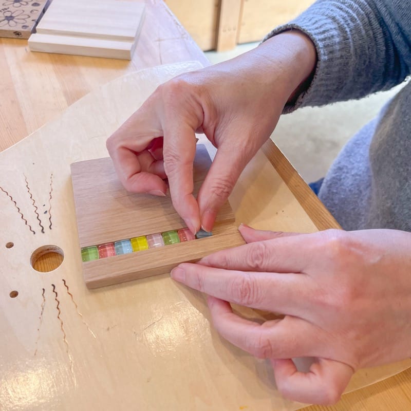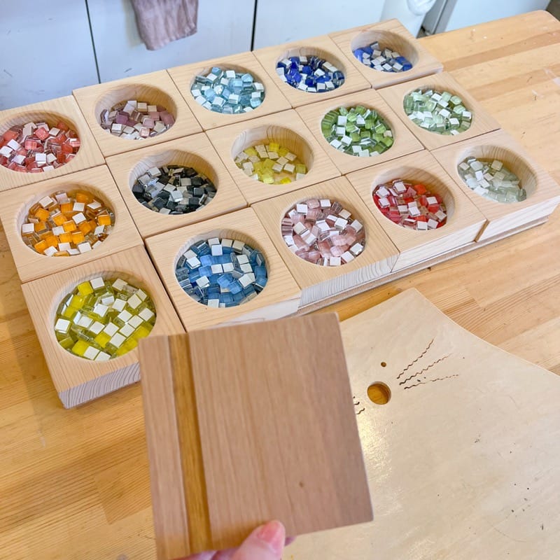 15色あるガラスのタイルから好きな色を選んでくぼみにはめ込んでいきます。