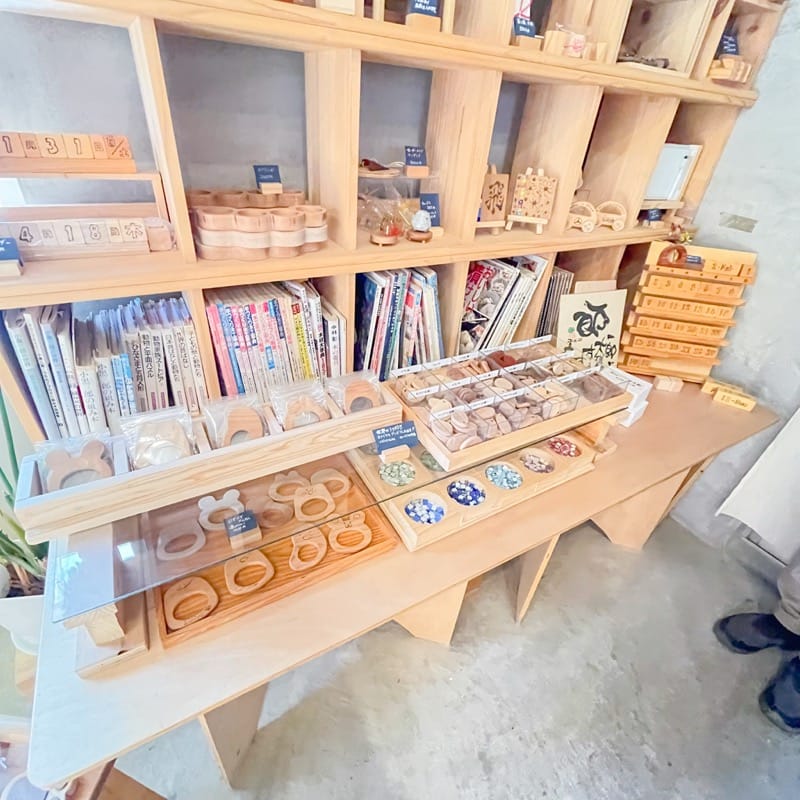 その反対側には木のカッティングボードやコースター、箸置きなど食卓で使う小物が並んでいます。