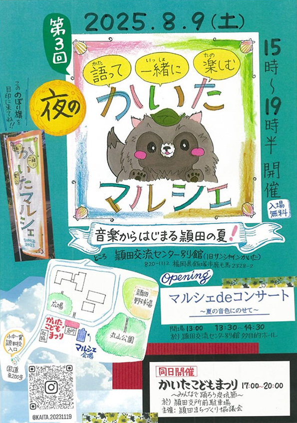 8月9日(土)、頴田交流センター別館で「第3回かいたマルシェ」が開催されます。