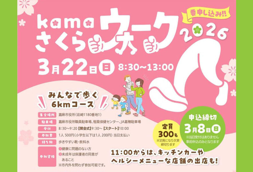 3月22日(日)、嘉麻市役所を発着点とする約6kmのウォーキングイベントが開催されます。稲築エリアの豊かな自然や歴史を感じながら、自分のペースで歩ける初心者にも優しいコースです。
