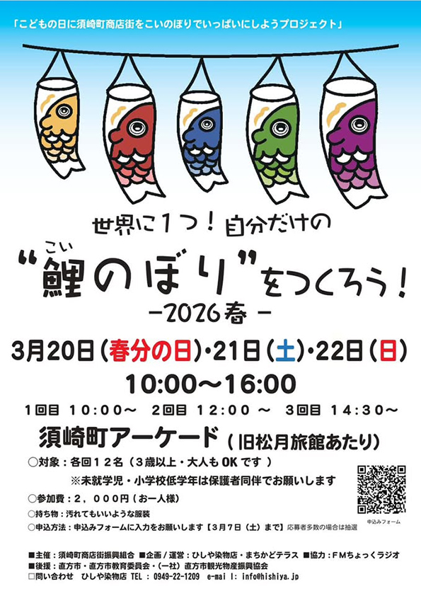 3月20日(金・祝)・21日(土)・22日(日)の3日間、須崎町アーケードで「世界に1つ!自分だけの“鯉のぼり”をつくろう!2026春」が開催されます!
