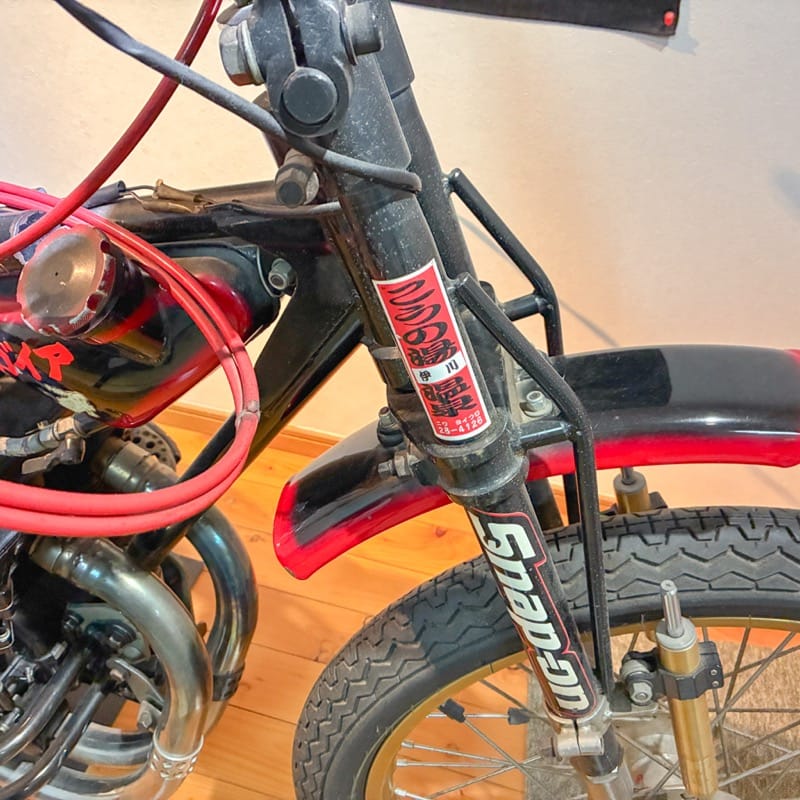 よく見てみると、フロントフォークに「こうの湯温泉」のロゴも見えます。
