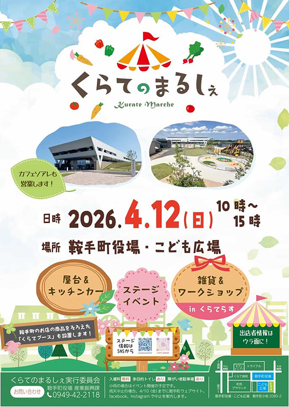 4月12日(日)、鞍手町役場およびこども広場で「くらてのまるしぇ」が開催されます。