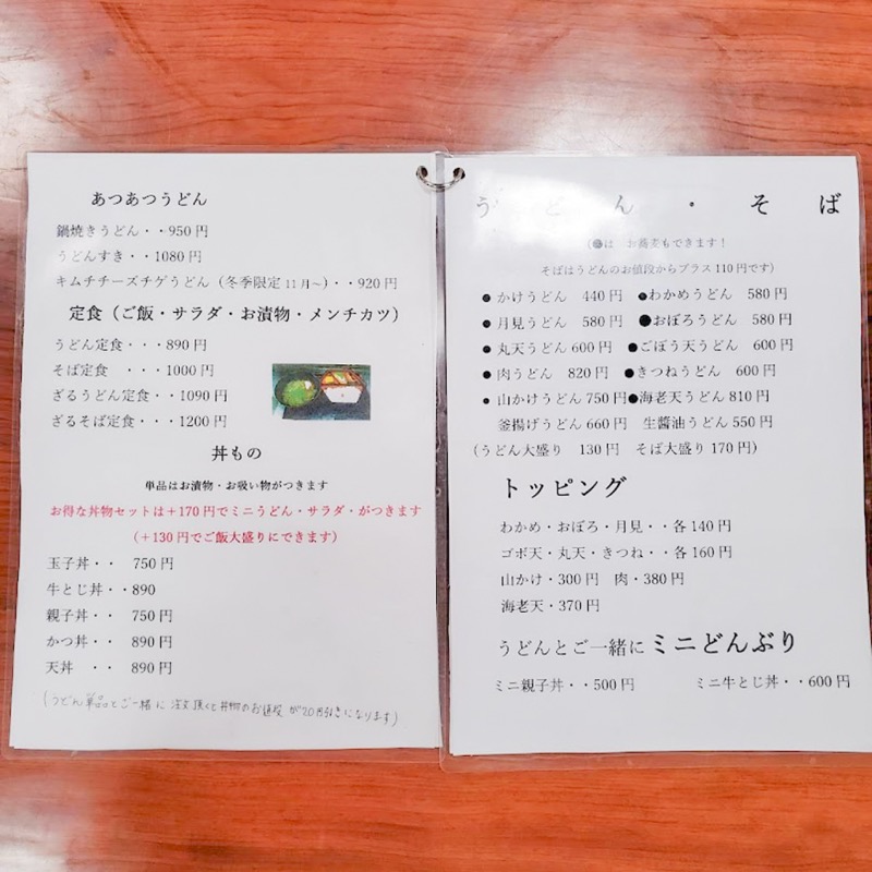 卓上のメニューを開くと、かけうどん(440円)やごぼう天うどん(600円)などの定番から各種定食、丼ものまで魅力的なラインナップが並んでいます。