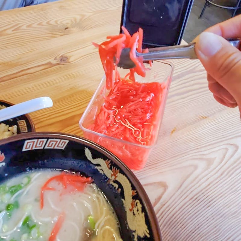 ずいぶん食べ進めましたが、ここで大好きな紅しょうがを投入。