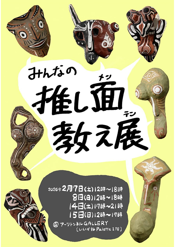 2月7日(土)・8日(日)・14日(土)・15日(日)の4日間、いいかねパレットで、お面アーティストの高津麦さんによる個展「みんなの推し面教え展」が開催されます。
