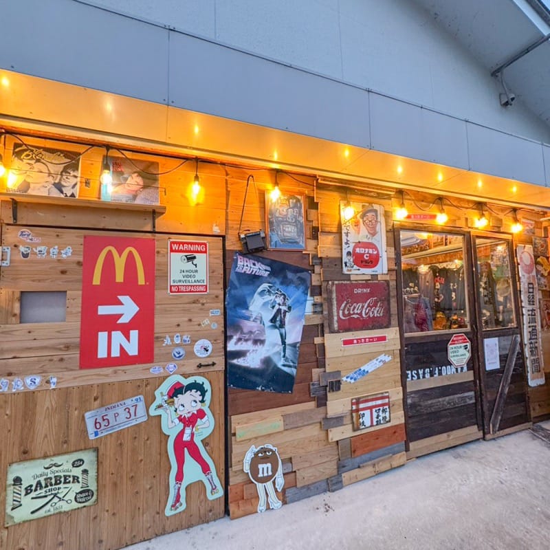 お店の外観は、レトロチックな看板やポスターが飾られています。