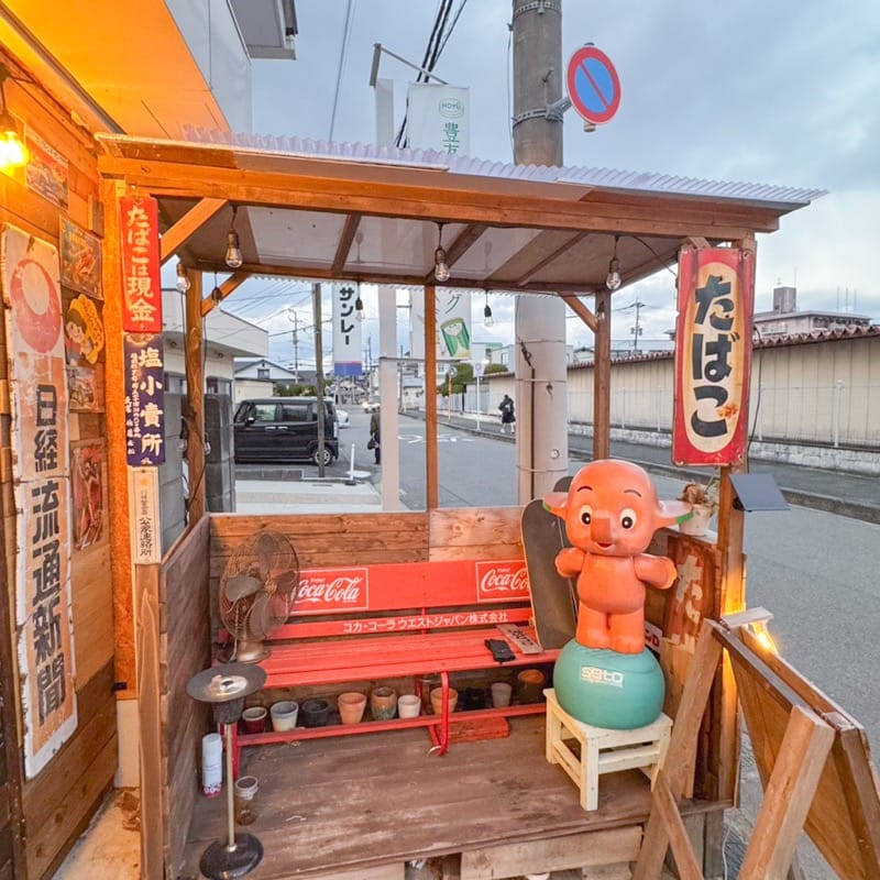 お店の入り口には、店主さんがDIYでつくったバス停のような喫煙所も!