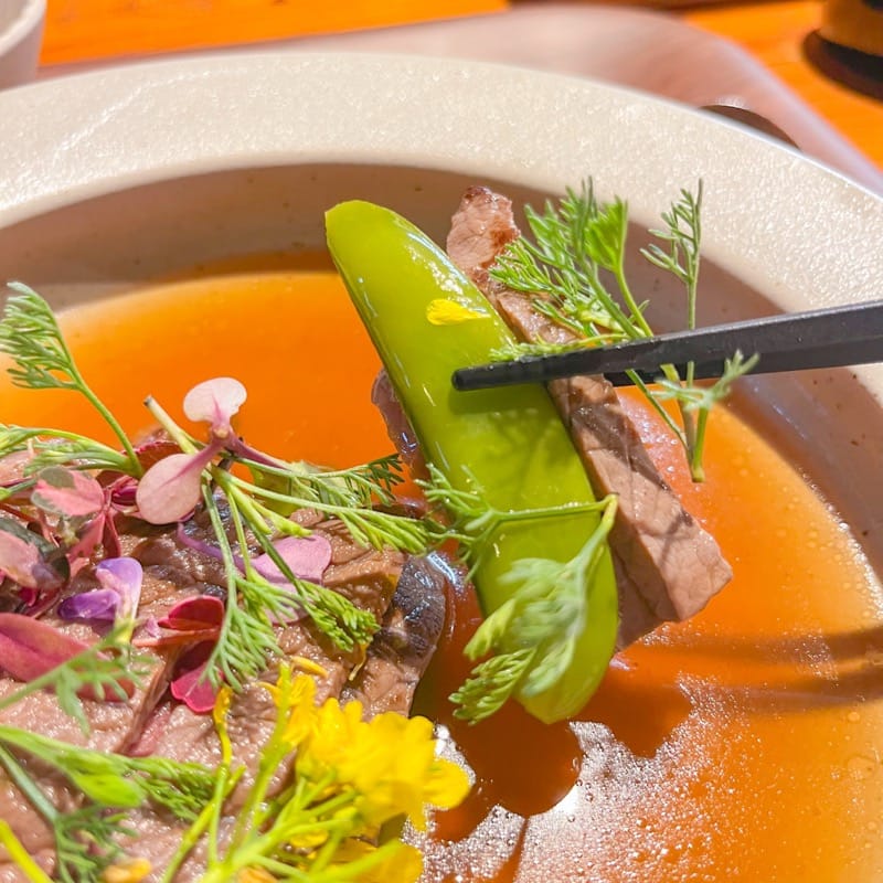 お出汁でお肉をいただくと最初は和食のような趣を感じますが、ハーブと一緒にいただいた瞬間に洋食のような華やかさへと表情を変えます。